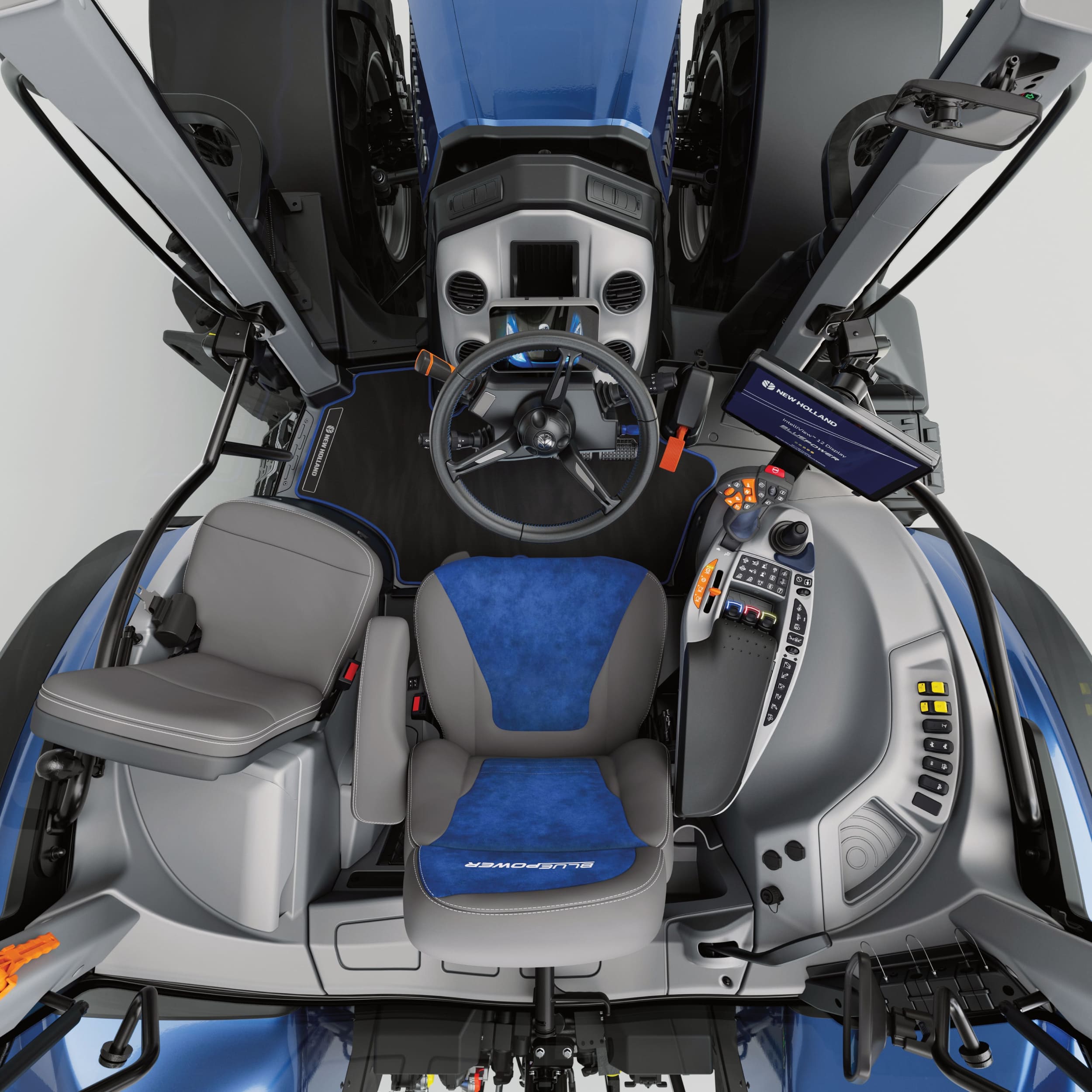 Hay cabinas que albergan al operador y cabinas que lo acompañan. Esta es de las segundas. Entras y el clima te recibe como debe: todo tiene su hueco y el día no se te cae encima. El ordenador de a bordo InfoView te da lo esencial de un vistazo; el monitor IntelliView™ 12 abre —como una tablet— el mundo del guiado y de la compatibilidad ISOBUS; el reposabrazos SideWinder™ concentra lo que manda, con botones configurables para trabajar a tu manera. Y si llevas pala, eliges el techo de alta visibilidad o Panorama para ver el cazo cuando más falta hace.